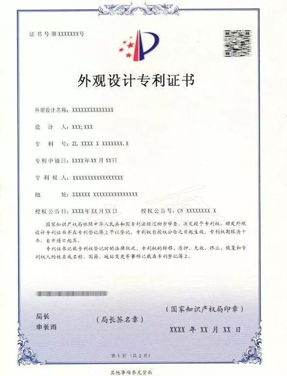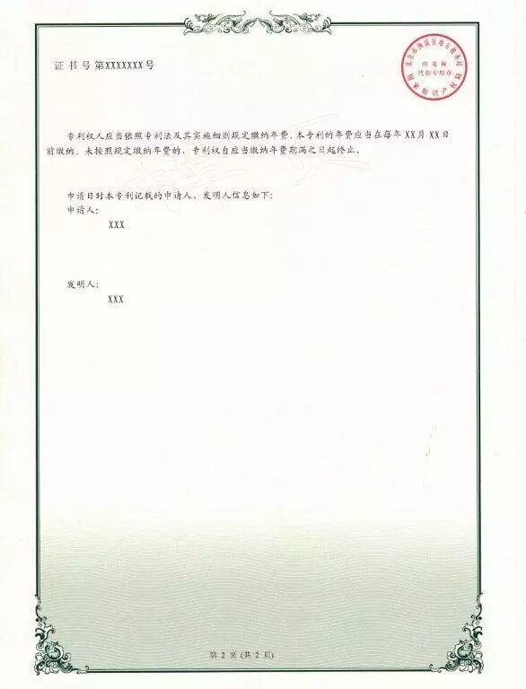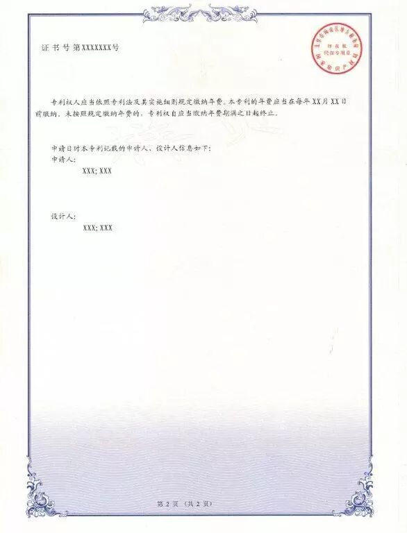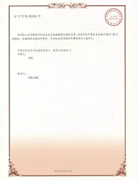 四、新版专利证书及专利证书副本不再使用专利证书封套,仍采用A4规格、竖排版;由单面改为正面、背面,背面只加框,没有徽标及印章;在证书正面原印花税标的位置增设二维码,将印花税标移至证书背面;在证书背面增设该专利申请日时的申请人、发明人或设计人信息。