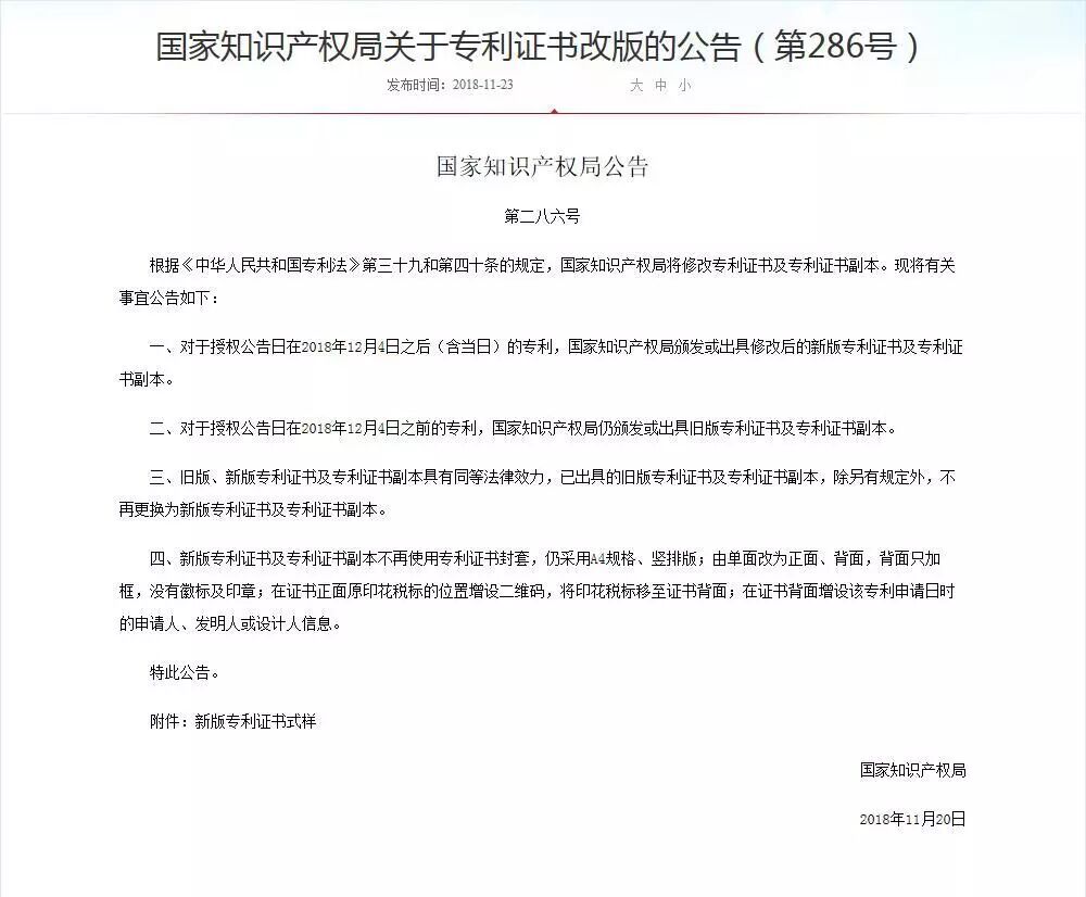 二、对于授权公告日在2018年12月4日之前的专利,国家知识产权局仍颁发或出具旧版专利证书及专利证书副本。