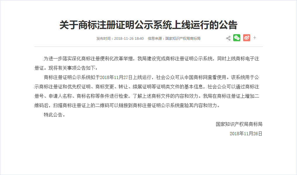 商标注册证明公示系统拟于2018年11月27日上线运行,社会公众可从中国商标网查看使用。该系统用于公示商标注册证和优先权证明、商标变更、转让、续展证明等证明类文件的基本信息,社会公众可以通过商标注册号、申请人名称、商标名称等条件进行检索,了解上述商标文件的内容和效力。我局在商标注册证上增加二维码后,扫描商标注册证上的二维码可以链接到商标注册证明公示系统查验其内容和效力。