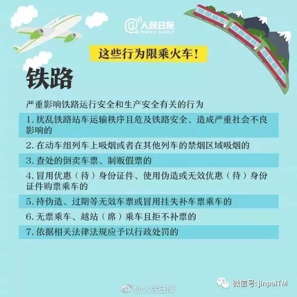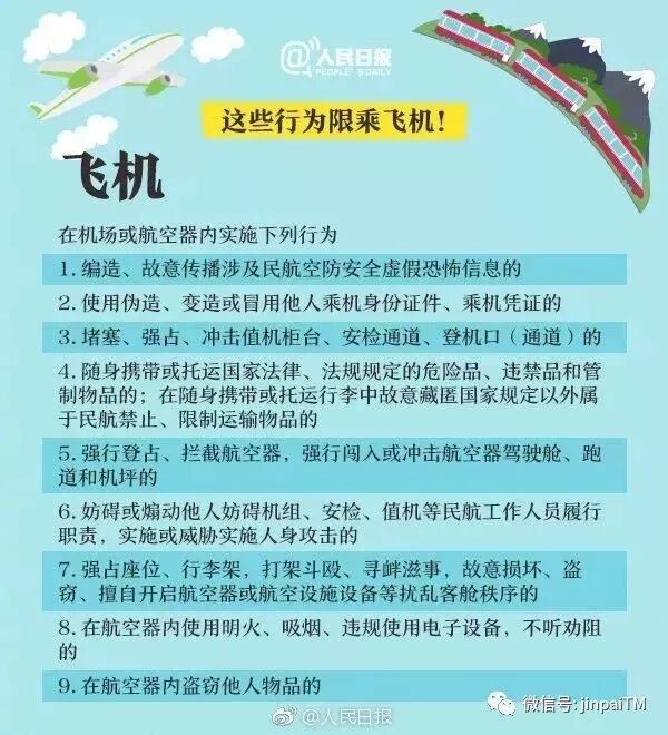 人民日报微博截图 @人民日报: 【守法千万条,诚信第一条!这些失信行为限乘飞机火车】近日,2018年失信黑名单年度分析报告发布。报告显示,2018新增限乘火车飞机处罚记录6959条,涉及当事人6908个。哪些严重失信行为会被限乘飞机火车?成了“老赖”还有哪些消费行为被限制?戳↓↓做事不守信,出行两行泪。转发周知!