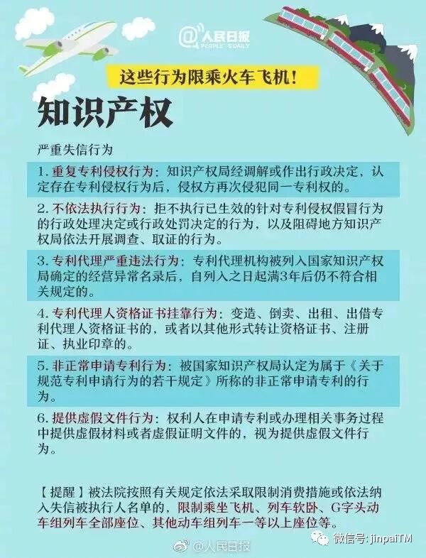 近日,人民日报官方微博发布【守法千万条,诚信第一条!这些失信行为限乘飞机火车】,其中提到以下6项知识产权失信行为限乘飞机火车: