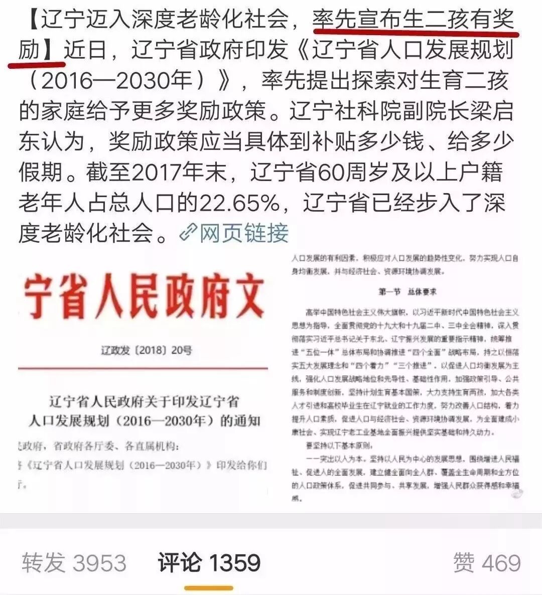 辽宁省政府印发了《辽宁省人口发展规划(2016-2030年)》,辽宁将完善生育家庭税收、教育、社会保障、住房等政策探索对生育二孩的家庭给予更多奖励政策,完善计划生育奖励假制度和配偶陪产假制度等。