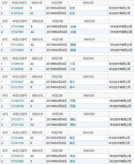 首先从申请的商标名称来看,均是与中国传统神话中的神兽相关;其次,如今在华为旗下已有多款芯片产品命名是与神兽名字相关的;再者,华为所申请的这堆商标均只申请了第9类和第42类,针对性强,从商标类别明细来看,这些商标名称极有可能是华为未来要推出的芯片产品。