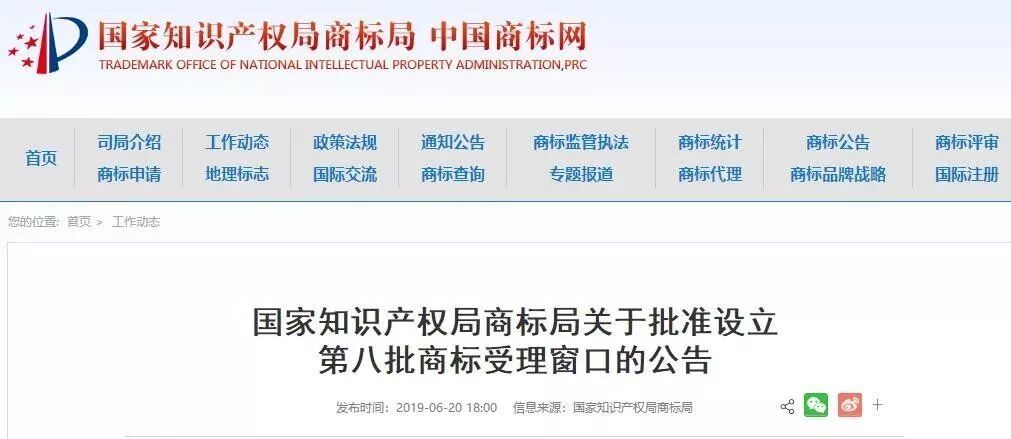6月20日,国家知识产权局商标局发布了“关于批准设立第八批商标受理窗口的公告”,公告显示根据《委托地方工商和市场监管部门受理商标注册申请暂行规定》,经研究,批准天津知识产权局等第八批9个地方市场监督管理部门、知识产权部门设立商标受理窗口,2019年6月20日正式启动运行,开展商标申请受理工作。