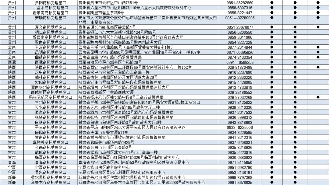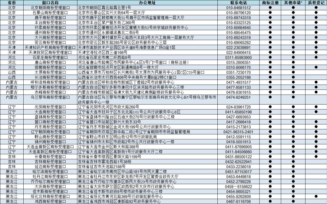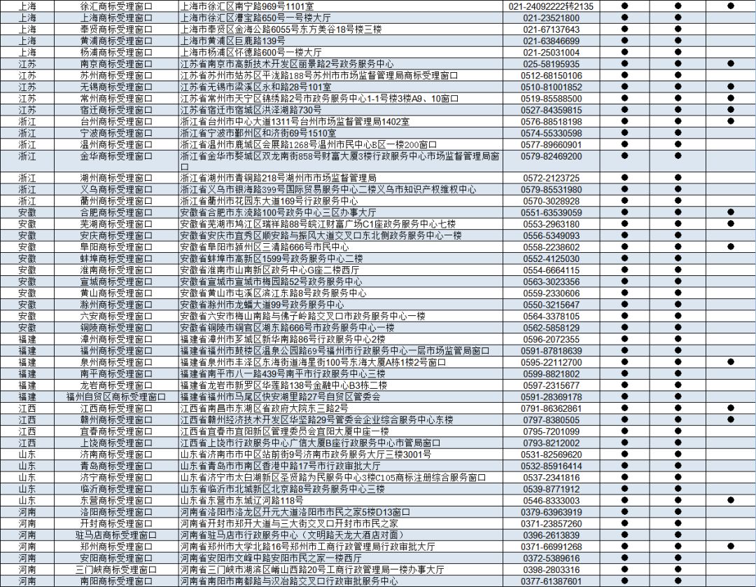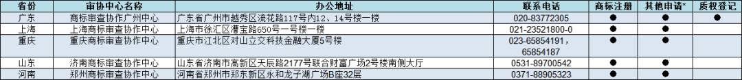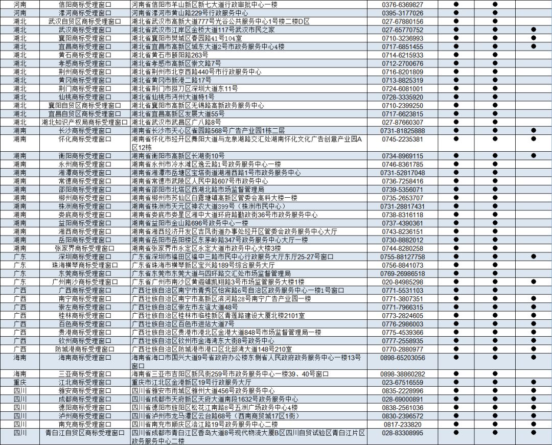 根据《委托地方工商和市场监管部门受理商标注册申请暂行规定》,经研究,批准天津知识产权局等第八批9个地方市场监督管理部门、知识产权部门设立商标受理窗口,2019年6月20日正式启动运行,开展商标申请受理工作。现将第八批商标受理窗口办公地址、联系电话公告如下: 一、天津知识产权局商标受理窗口 办公地址:天津市高新技术产业园区华天道6号海泰信息广场G座1层 联系电话:022-23039891 二、天津自贸区商标受理窗口 办公地址:天津空港经济区西三道166号 联系电话:022-84906415 三、大连金普新区商标受理窗口 办公地址:辽宁省大连市金州区斯大林路388号 联系电话:0411-87696905 四、大连高新区商标受理窗口 办公地址:辽宁省大连高新园区高新街1号行政服务大厅二楼 联系电话:0411-84506860 五、福州自贸区商标受理窗口 办公地址:福建省福州市马尾区快安湖里路27号自贸区管委会 联系电话:0591-28369178 六、湖北知识产权局商标受理窗口 办公地址:湖北省武汉市武昌区广八路8号 联系电话:027-87660307 七、广州南沙商标受理窗口 办公地址:广东省广州市南沙区黄阁镇凯翔路3号市场监管服务大楼1楼 联系电话:020-84985298 八、青白江自贸区商标受理窗口 办公地址:四川省成都市青白江区香岛大道8号现代物流大厦B区四川自贸试验区青白江片区政务服务中心二楼 联系电话:028-83308995 九、黔南商标受理窗口 办公地址:贵州省黔南州都匀市民族路35号黔南州政务大厅 联系电话:0854-8227228 特此公告。 国家知识产权局商标局 2019年6月20日 附: 京外商标审查协作中心和地方商标受理窗口汇总 来源:商标局网站 可办理业务详情 : 《商标注册申请》 《撤回商标注册申请》 《出具优先权证明文件申请》 《商标续展注册申请》 《撤回商标续展注册申请》 《变更商标申请人/注册人名义/地址、变更集体商标/证明商标管理规则/集体成员名单申请》 《撤回变更商标申请人/注册人名义/地址、变更集体商标/证明商标管理规则/集体成员名单申请》 《变更商标代理人/文件接收人申请》 《撤回变更商标代理人/文件接收人申请》 《删减商品/服务项目申请》 《撤回删减商品/服务项目申请》 《转让/移转申请/注册商标申请》 《撤回转让/移转申请/注册商标申请》 《商标使用许可备案》 《变更许可人/被许可人名称备案》 《商标使用许可提前终止备案》 《撤回商标使用许可备案》 《商标注销申请》 《撤回商标注销申请》 《补发变更/转让/续展证明申请》 《补发商标注册证申请》 《马德里国际商标出具商标注册证明申请》 《更正商标申请/注册事项申请》 《马德里商标国际注册申请》