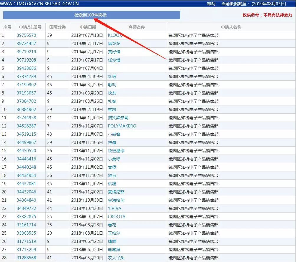 从天眼查上查询得知,商标权人“镜湖区知桥电子产品销售部”,注册于安徽省芜湖市,成立于2017年8月29日,注册资金仅为0.002万,成立后不到一个月,知桥公司就申请了3个不同的商标。此后,基本每个月都申请几个完全不重样的商标。经国家商报局查询网站查询,截至2019年7月18日该公司陆续申请了109件商标;