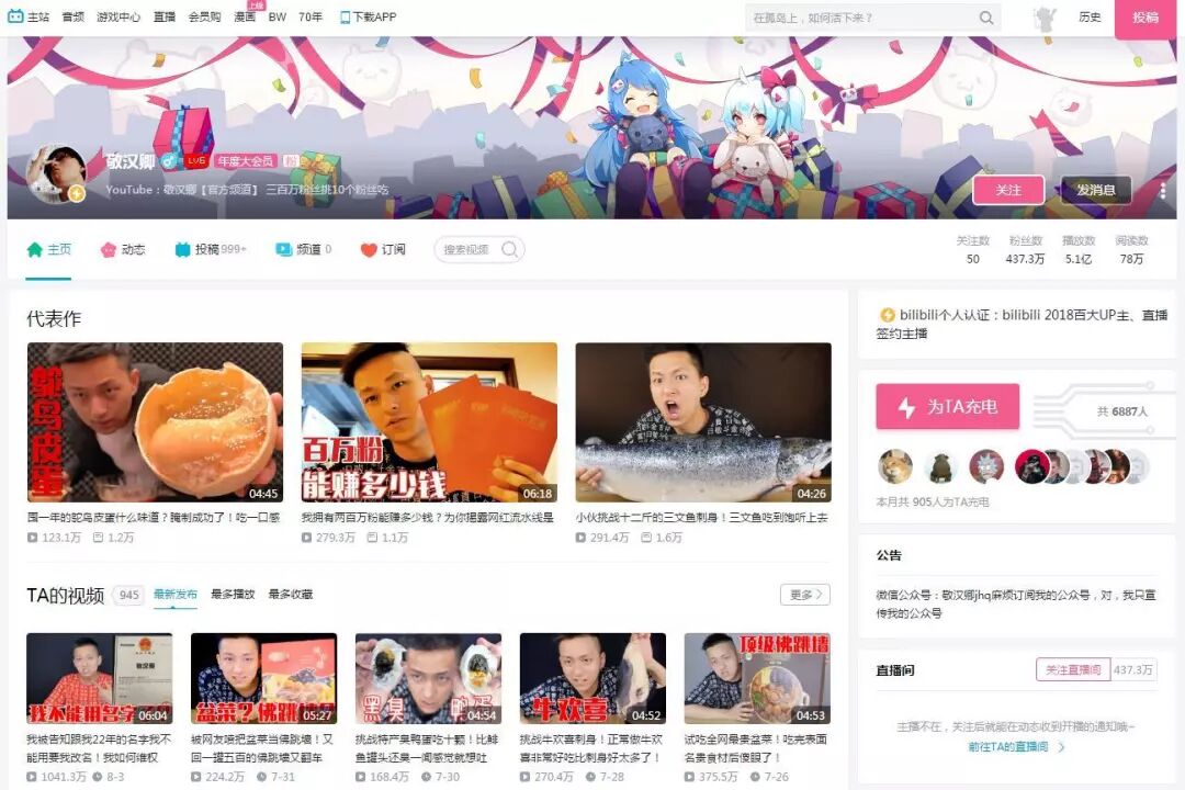 敬汉卿是知名美食领域创作者,创作了很多“作死”视频,有些网友称他为“死神之子”各平台粉丝数加起来大概过千万。B站粉丝437.3万,今日头条668万,就光这两个平台就有千万粉丝了,其它平台还没有计算在内。