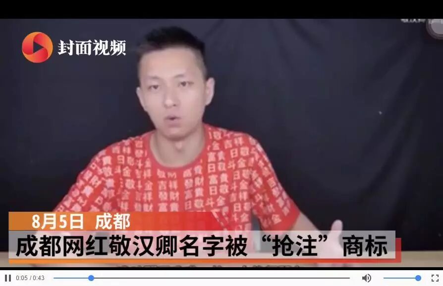 8月3日,敬汉卿在某网络平台上发布了一段短视频。他在视频里说,自己使用了22年的名字,被安徽一家公司注册了商标,对方告诉自己,如果继续使用,将采取法律措施。