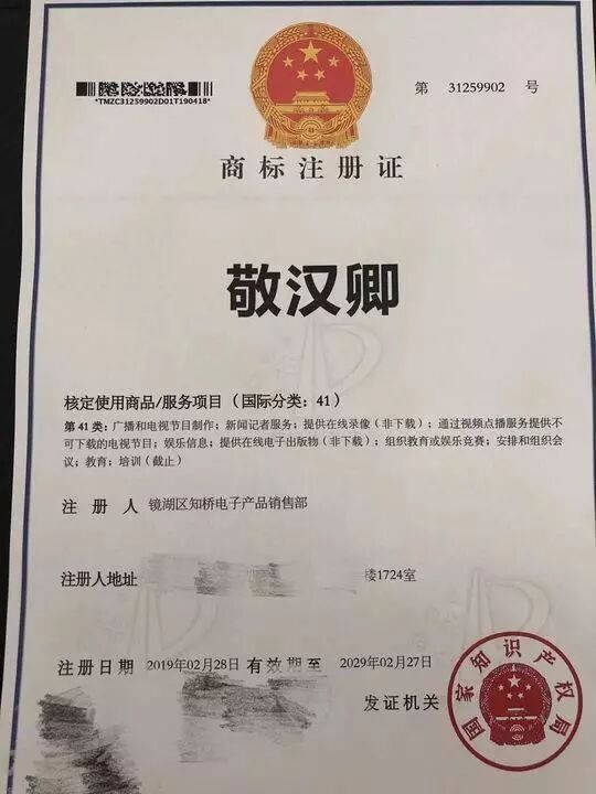 敬汉卿说,7月30日,自己收到这家公司发的一封邮件。该公司在邮件中称,自己是“敬汉卿”注册商标持有人,并且商标被核定使用在第41类娱乐节目、视频节目制作和下载等服务上。